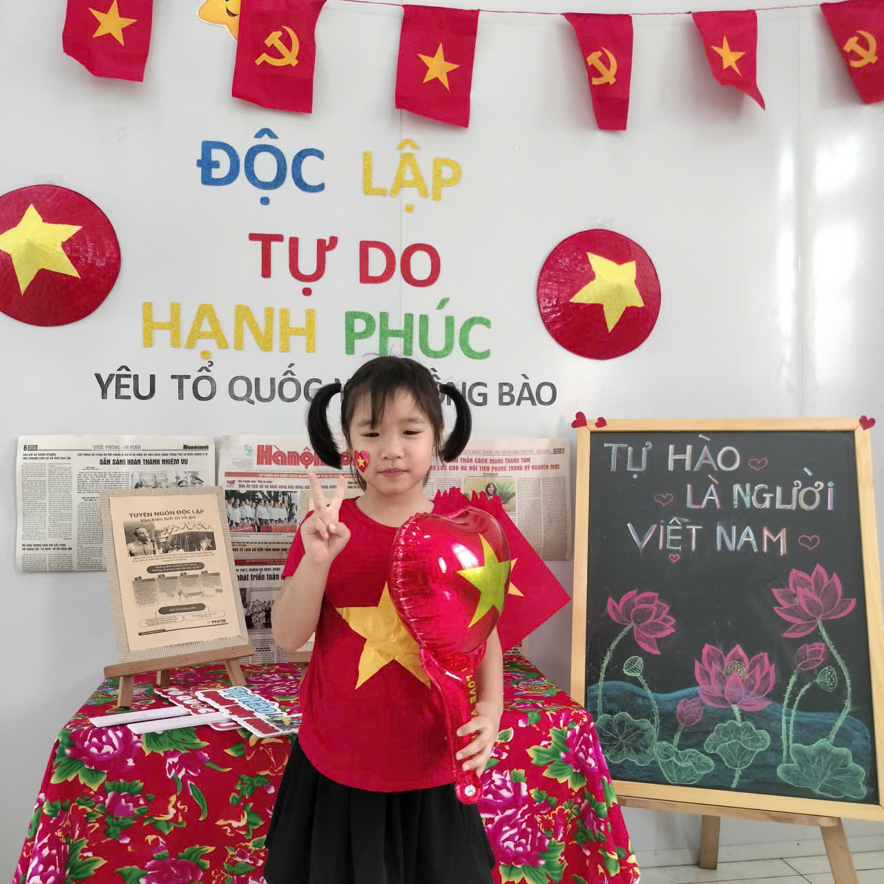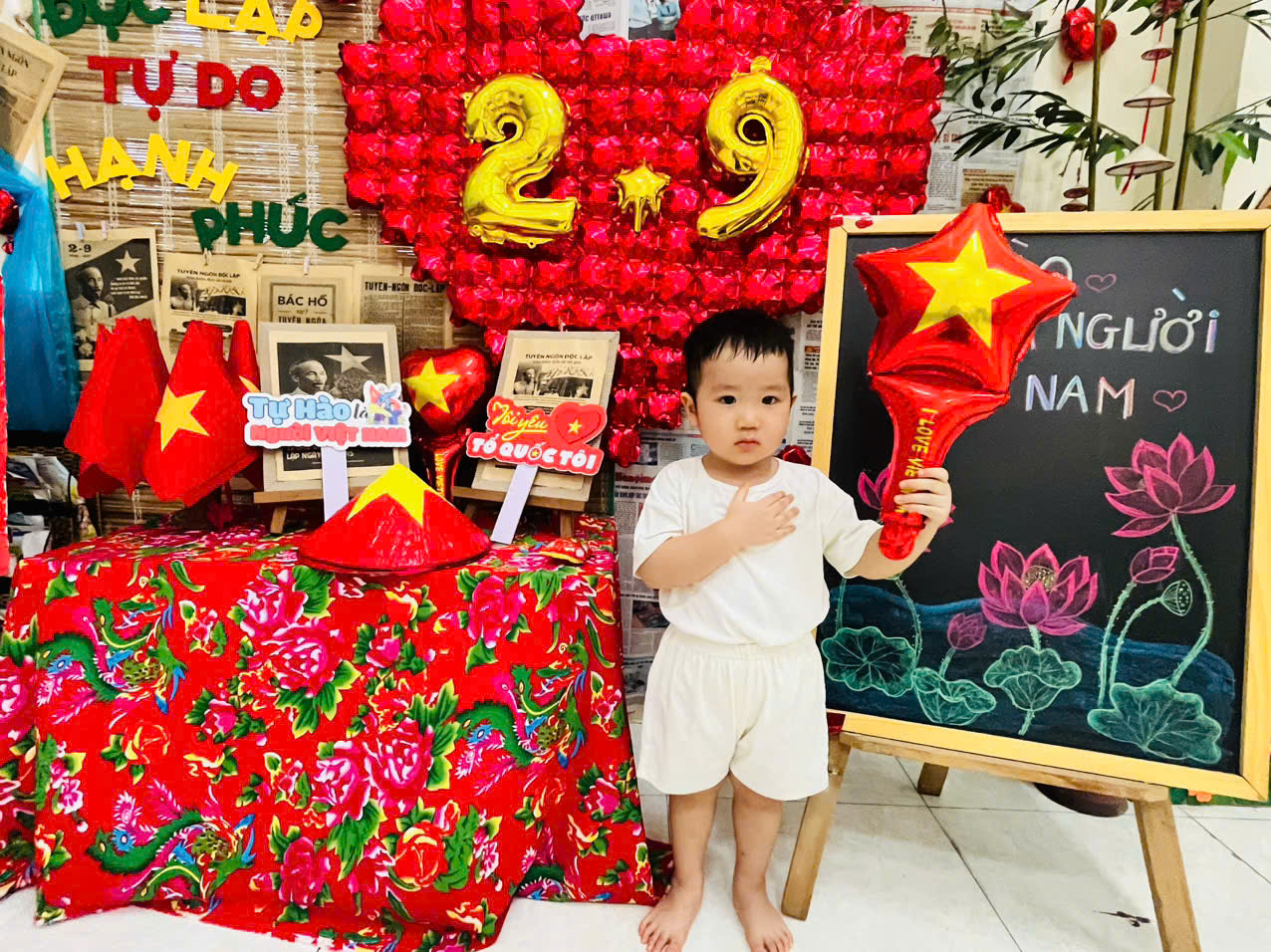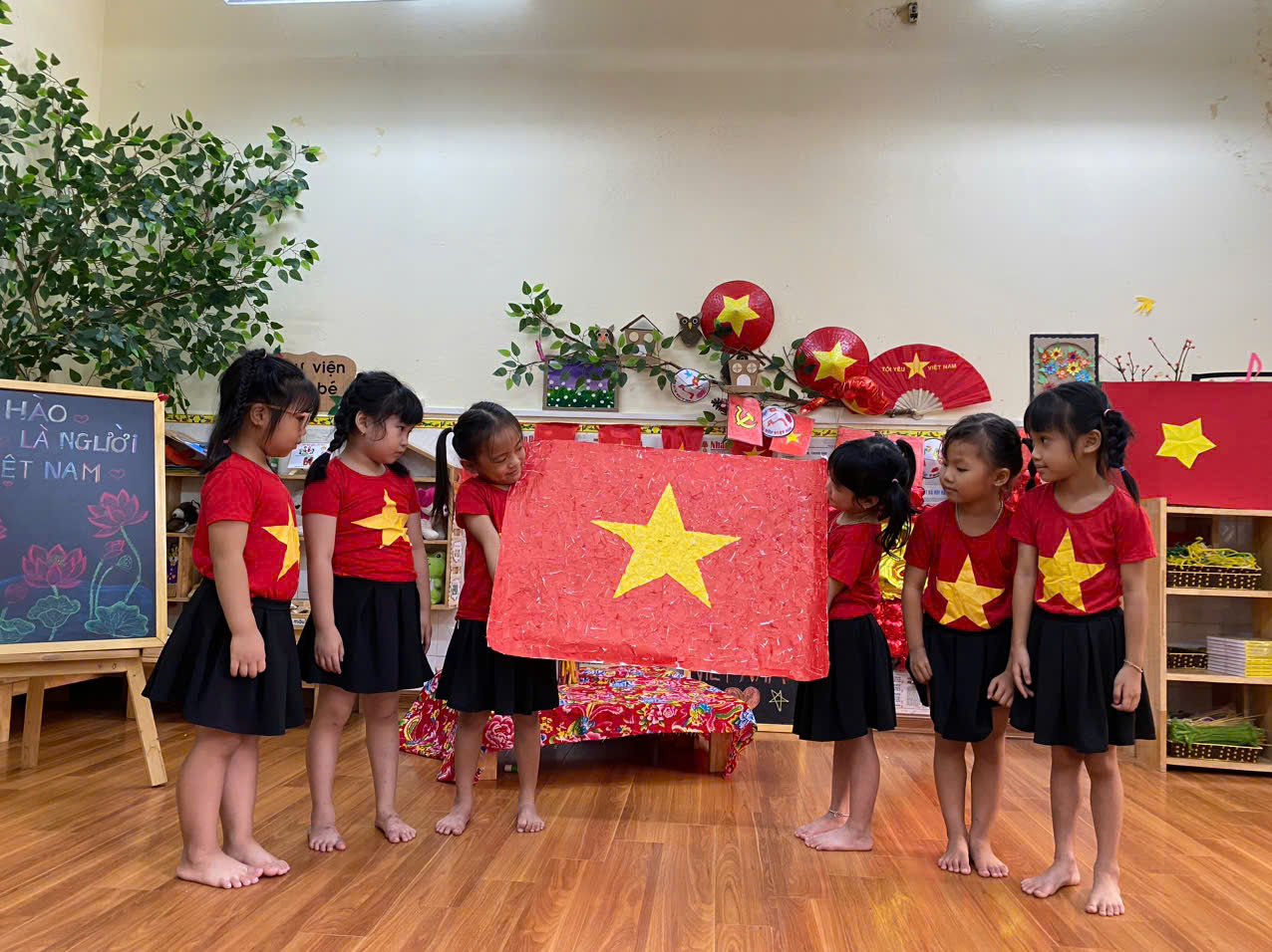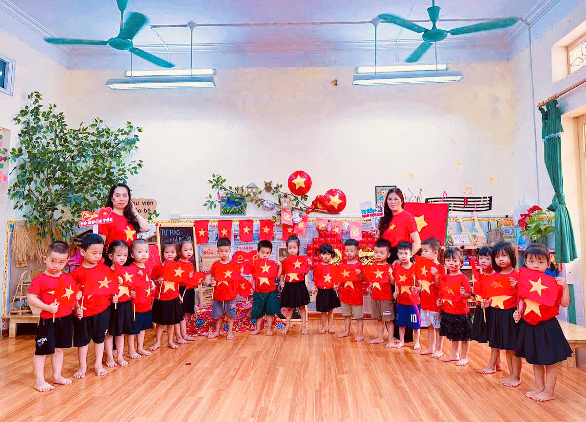 Ngay từ đầu tuần, không gian lớp học đã được cô và trò cùng nhau trang trí rực rỡ với sắc đỏ của cờ Tổ quốc, những dải cờ đỏ, tranh ảnh và khẩu hiệu chào mừng. Các bé hồn nhiên, hào hứng tham gia cắt dán, tô màu, treo cờ, góp phần làm đẹp thêm lớp học của mình. Tiếng cười, tiếng hát trong trẻo vang lên khi các con tập luyện những bài hát, điệu múa ca ngợi quê hương, đất nước và Bác Hồ kính yêu.
