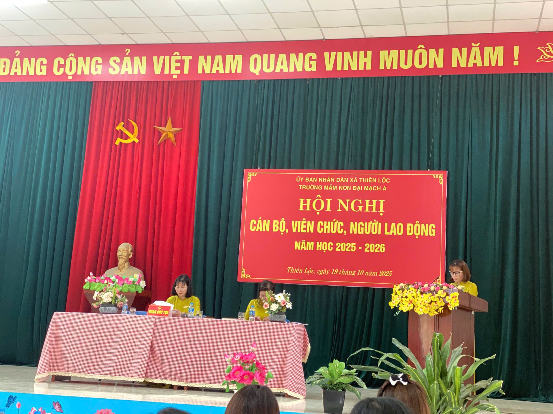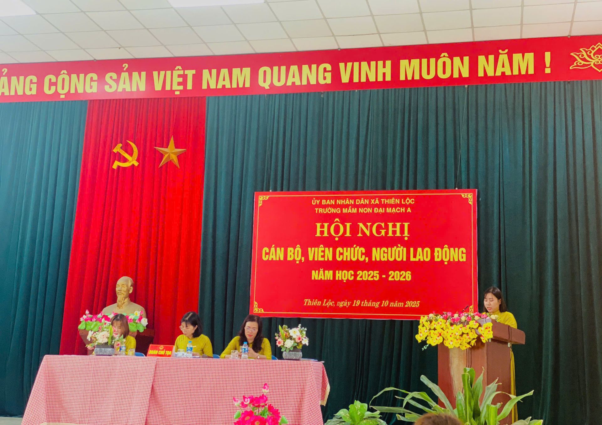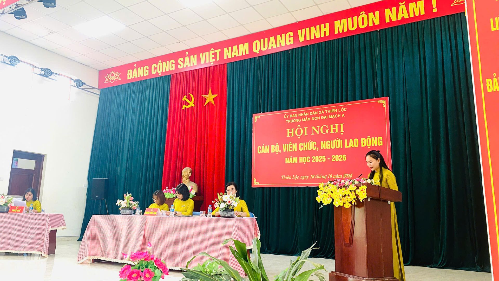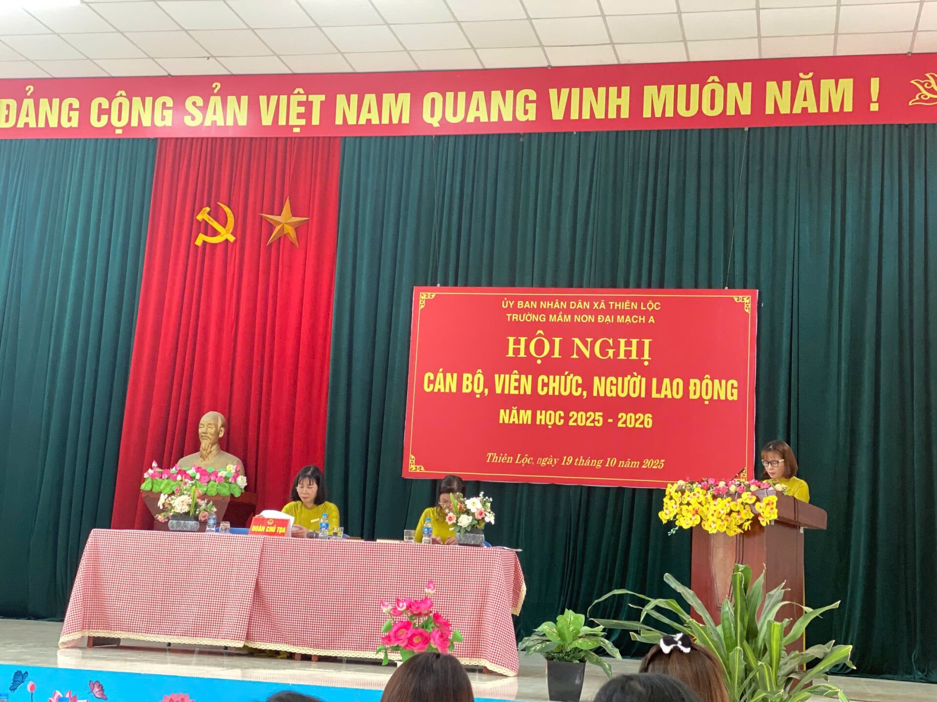 Sáng ngày 19/10/2025, Trường Mầm non Đại Mạch A long trọng tổ chức Hội nghị Cán bộ, Viên chức, Người lao động năm học 2025–2026. Hội nghị là dịp quan trọng để tập thể sư phạm nhà trường cùng nhìn lại kết quả đạt được trong năm học 2024–2025, đồng thời xác định phương hướng, mục tiêu và nhiệm vụ trọng tâm cho năm học mới.