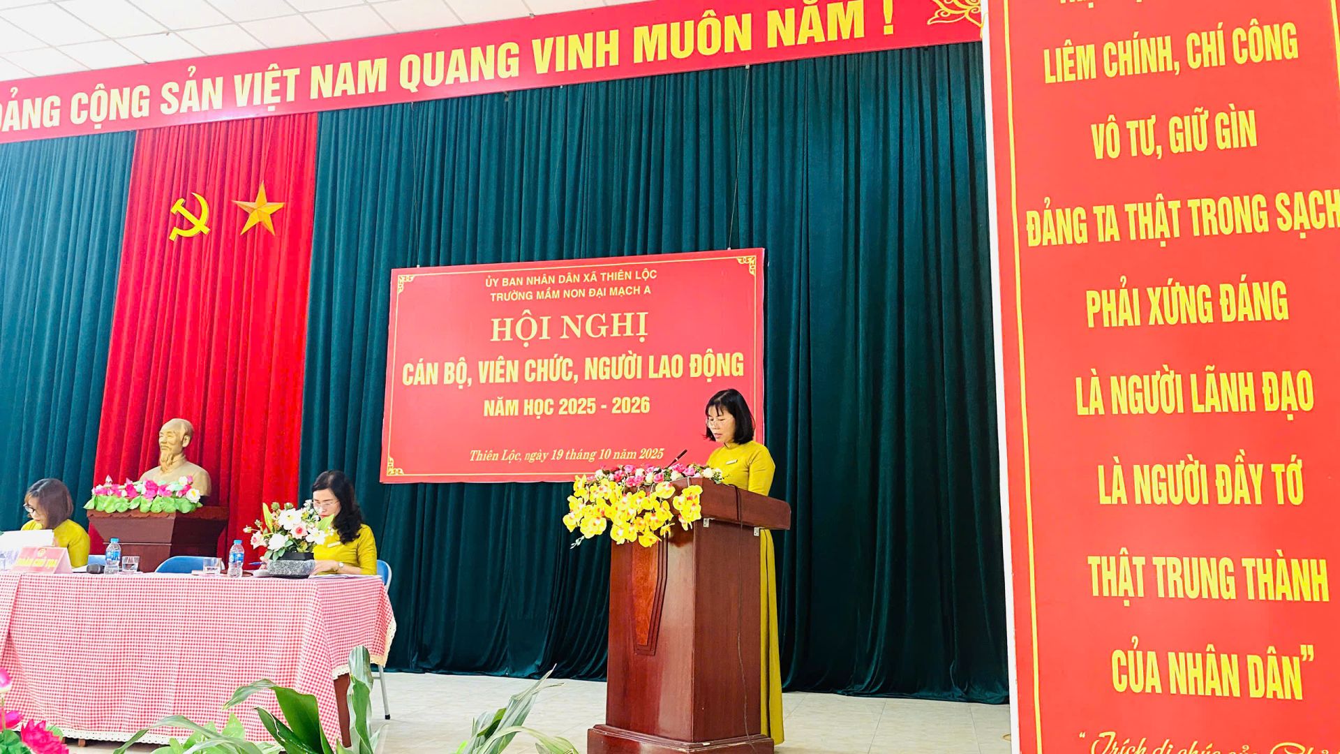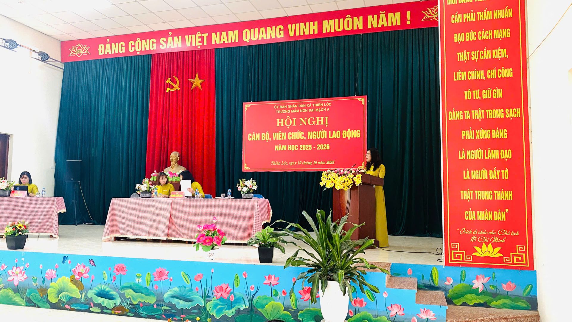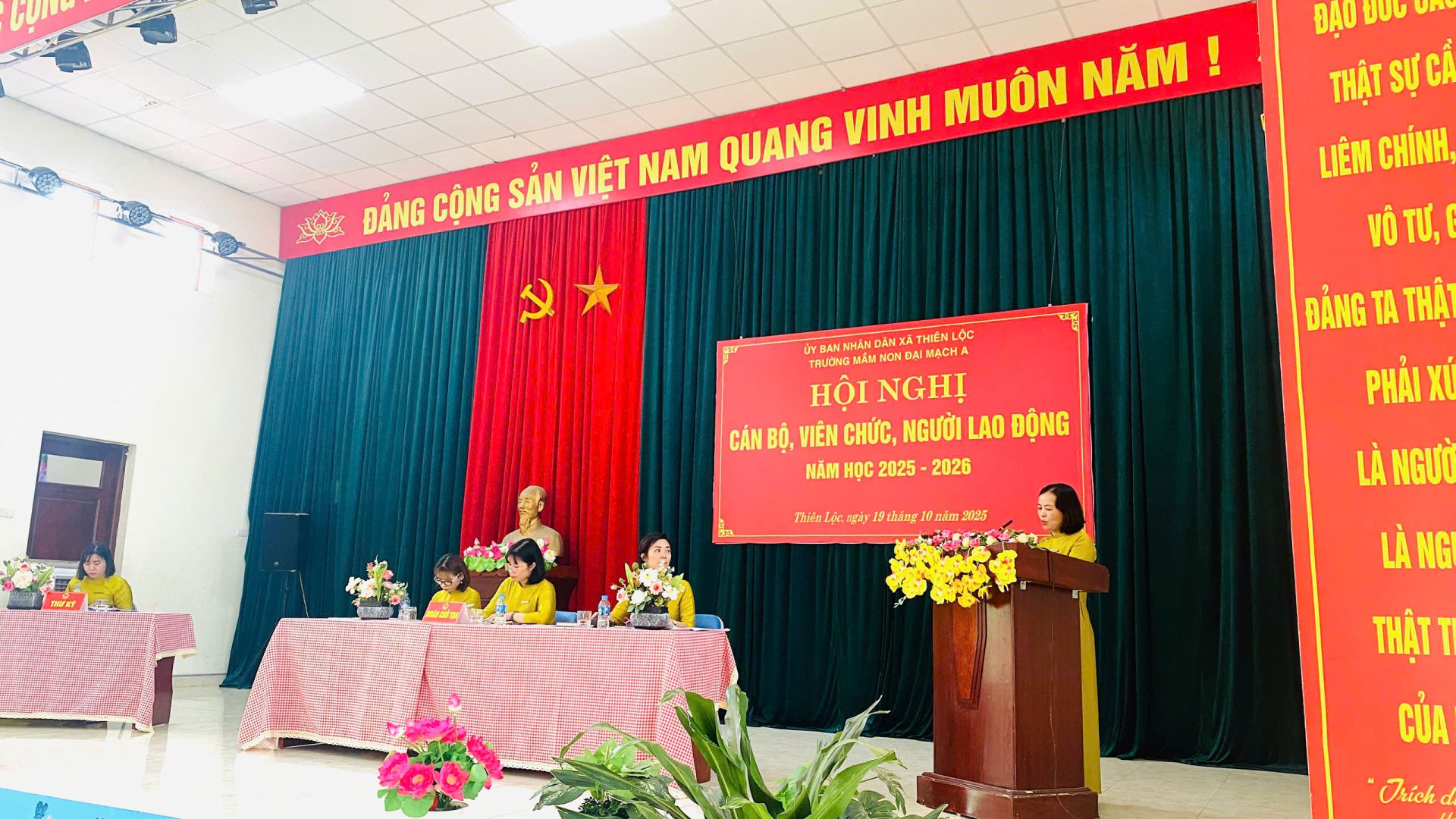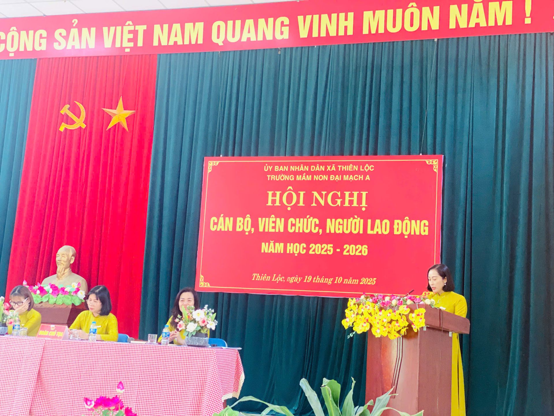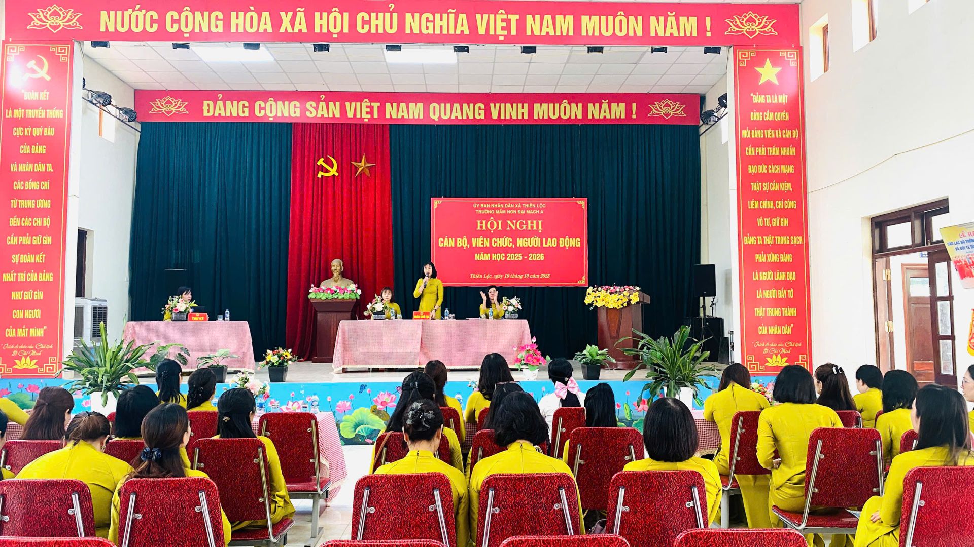 Sáng ngày 19/10/2025, Trường Mầm non Đại Mạch A long trọng tổ chức Hội nghị Cán bộ, Viên chức, Người lao động năm học 2025–2026. Hội nghị là dịp quan trọng để tập thể sư phạm nhà trường cùng nhìn lại kết quả đạt được trong năm học 2024–2025, đồng thời xác định phương hướng, mục tiêu và nhiệm vụ trọng tâm cho năm học mới.