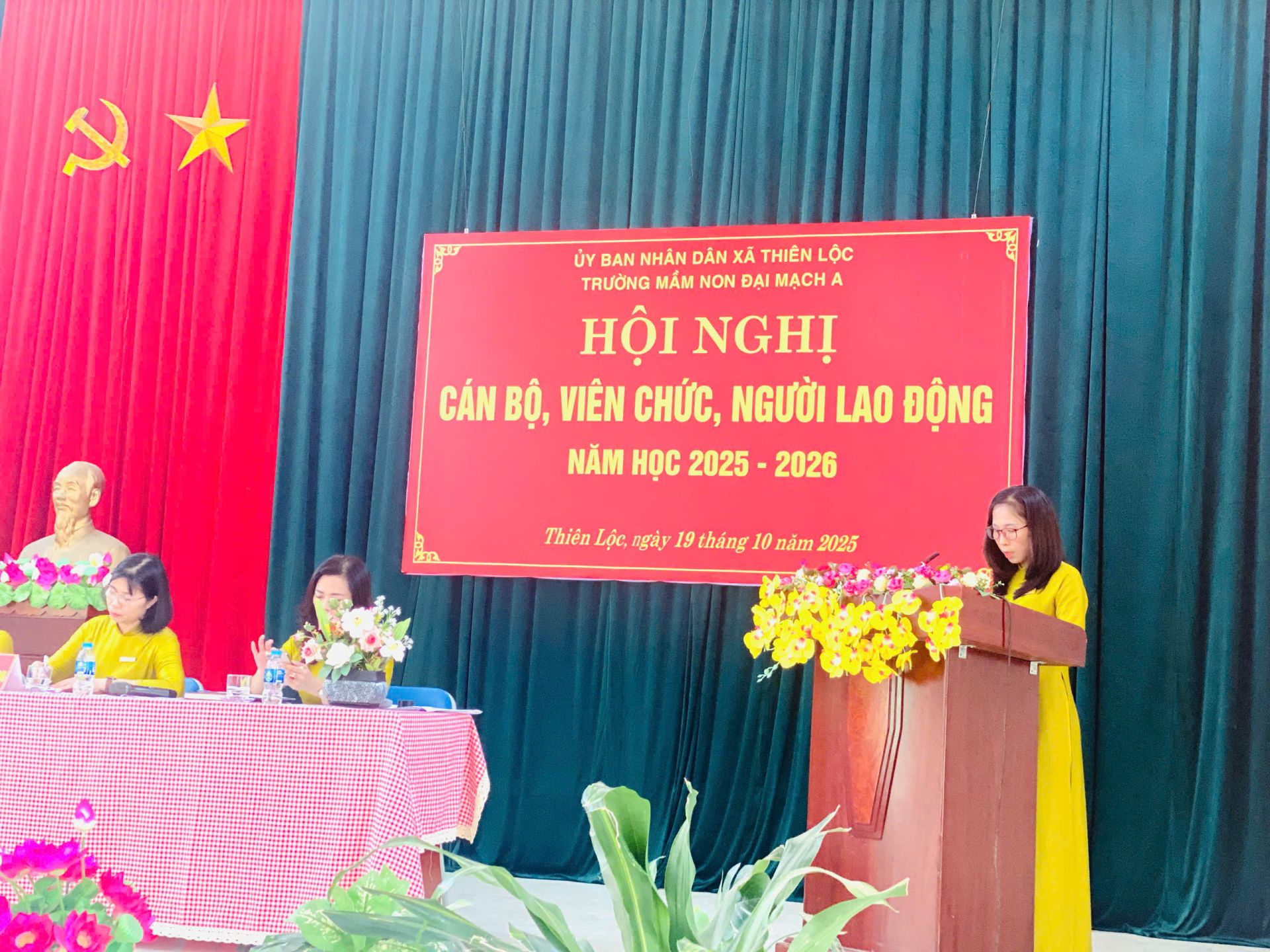 Đồng chí Nguyễn Thị Thanh Huyền – Phó Hiệu trưởng trình bày nội dung thi đua năm học 2025–2026, khẳng định quyết tâm xây dựng đội ngũ cán bộ, giáo viên, nhân viên có năng lực, trách nhiệm, sáng tạo và đoàn kết – hướng tới phong trào thi đua đạt hiệu quả cao.
